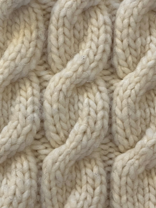 Un tejido de cable en espiral diseñado para un estilo moderno en lana merino 100% increíblemente suave y naturalmente elástica que se corta, hila y tiñe en Nueva Zelanda.