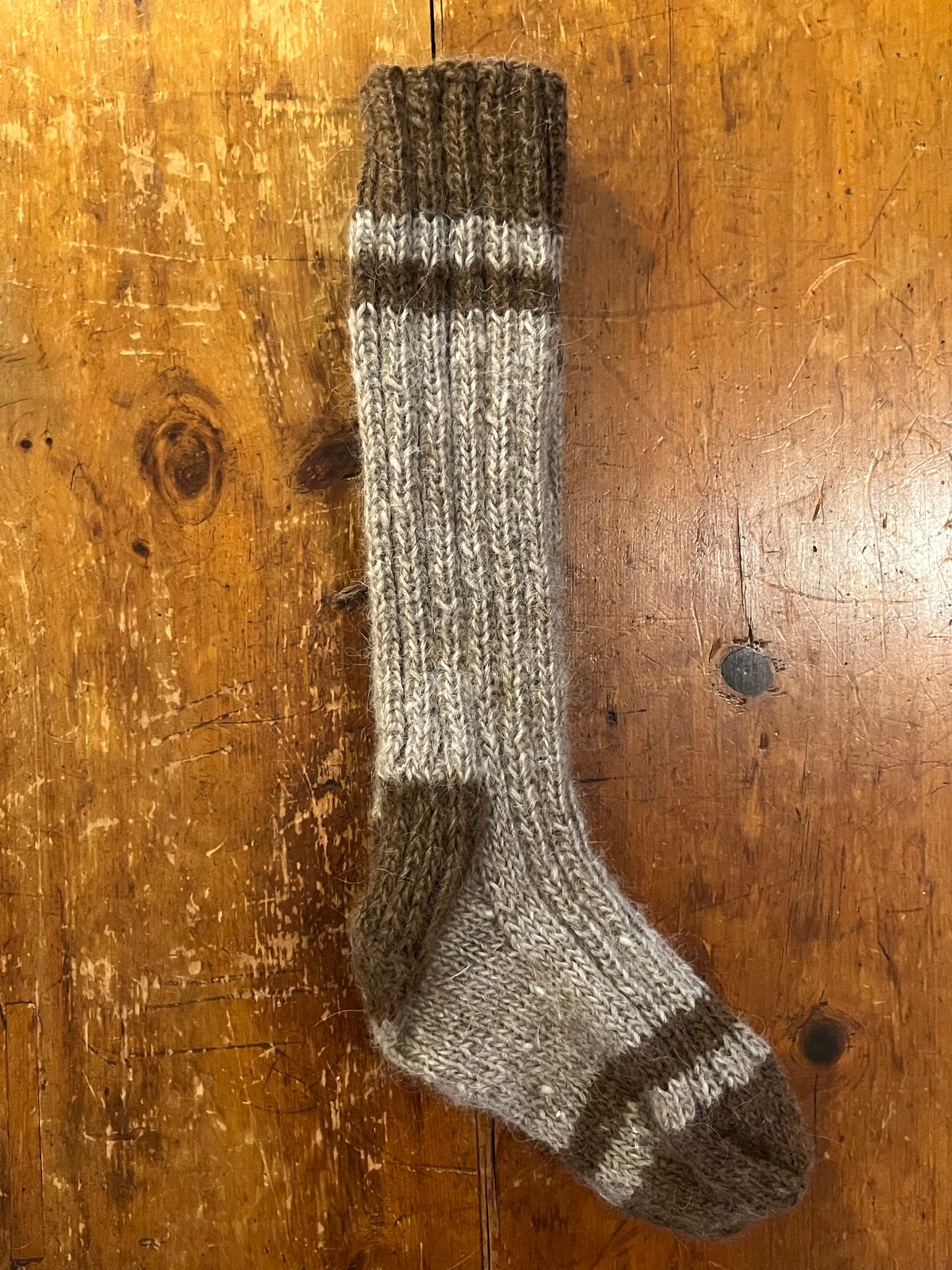 Rustic and warm! Danish design with a traditional heel pocket, this piece functions as sock, slipper or boot liner. Item is one pair of socks. Please note that colors can vary slightly by batch of wool as none of this yarn is dyed. Lengths can vary slightly as well (each pair is unique).